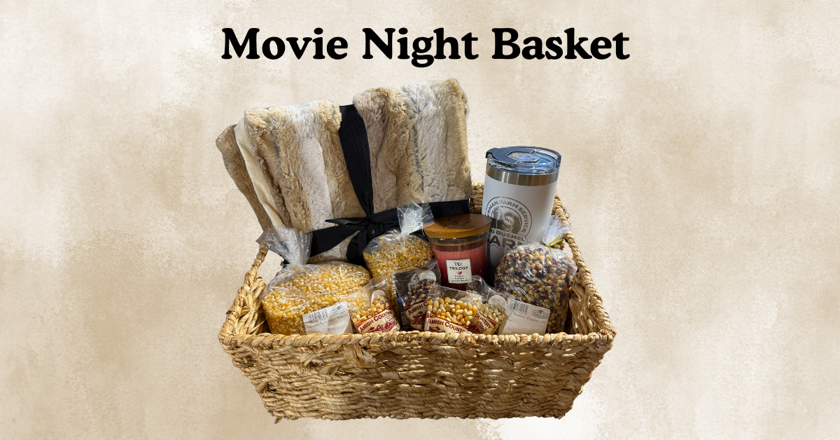 Donated by: Anonymous Donor Everything you need for a cozy movie night! This basket has a faux fur throw, a Trilogy candle, rainbow popcorn, Hulls Ladyfinger popcorn, mini Amish popcorn bags, and a Stanley Bierman Farms Service cup!!